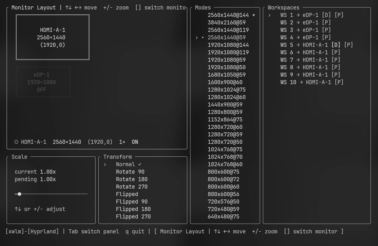 xwlm lets you arrange, resize, rotate, and toggle your monitors from the terminal. It auto-detects your compositor, reads the current monitor state over Wayland, and writes native config files when you apply changes. No more hand-editing monitors.conf.