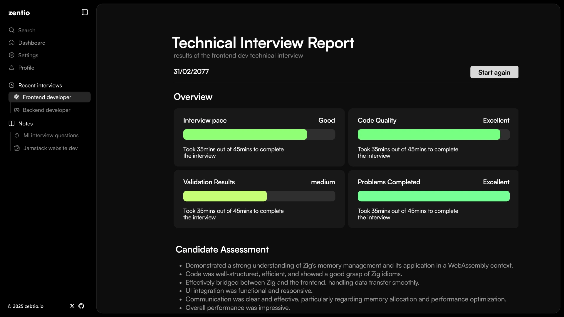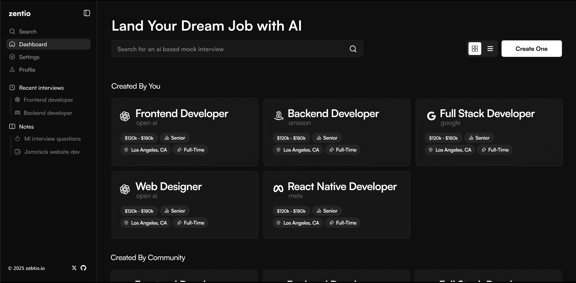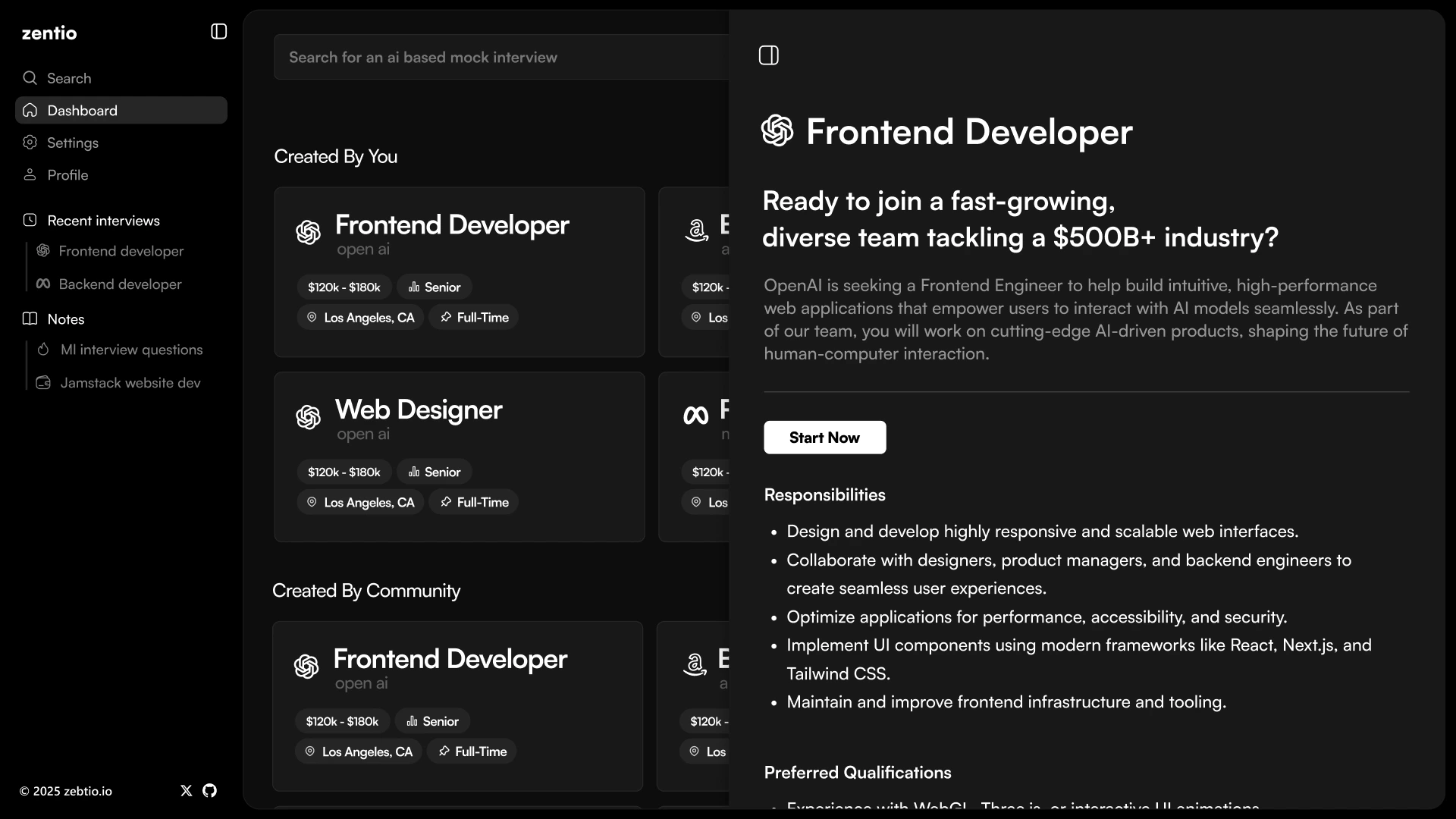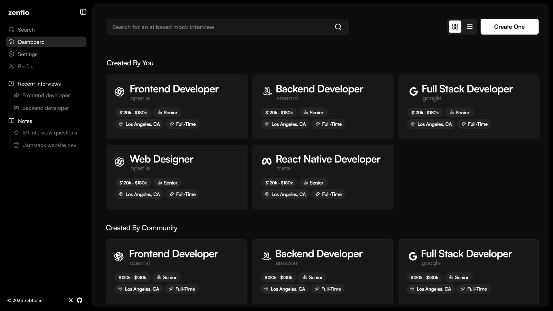Zentio is a mock interview platform for tech students and graduates. Practice with coding problems in a built-in IDE, get AI-generated questions tailored to your target role and difficulty, and review feedback after each session. You can run through interviews solo or explore ones shared by the community.